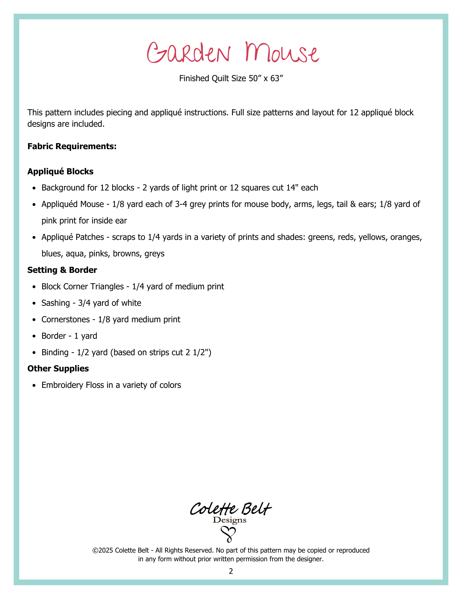 Garden Mouse Quilt Pattern is part of the Garden Mouse Collection. Pattern includes appliqué instructions, appliqué patterns for 12 Garden Mouse blocks, setting and border instructions. Finished quilt size is 50" x 63".