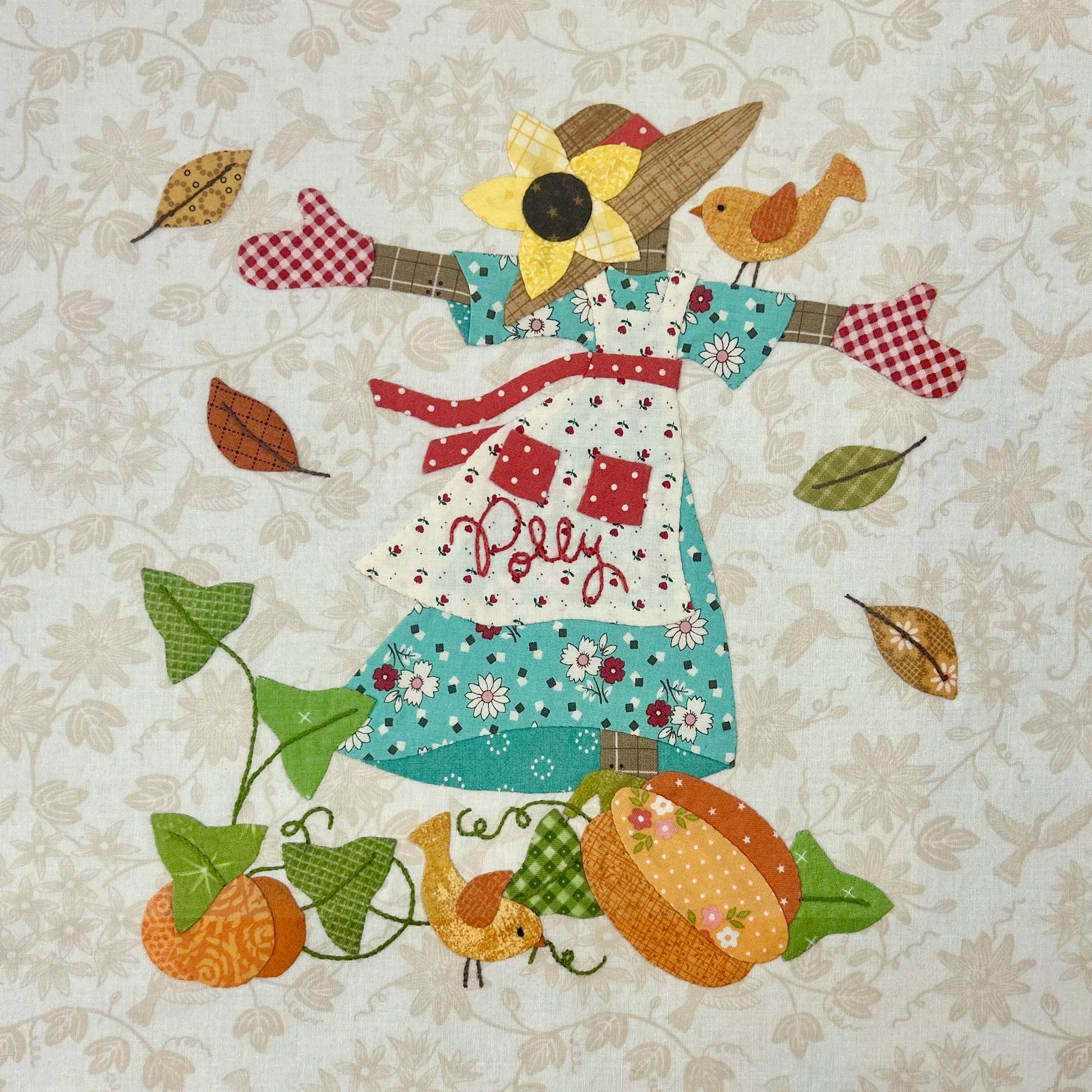 Miss Polly Scarecrow appliqué quilt block is block 2 of the Polly's Pumpkin Patch Collection. Pattern includes instructions, full-size pattern and layout for appliqué and embroidery design. Block finished size is 12" square.