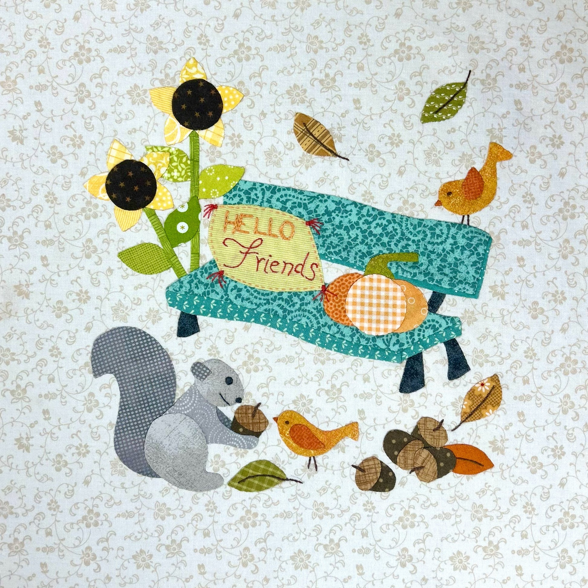 Friendship Bench appliqué quilt block is block 8 of the Polly's Pumpkin Patch Collection. Pattern includes instructions, full-size pattern and layout for appliqué and embroidery design. Block finished size is 12" square.